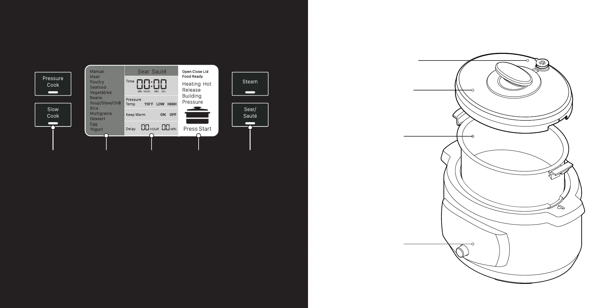 1. Cooking Functions: Pressure Cook, Slow Cook, Steam and Sear/Sauté. Select your