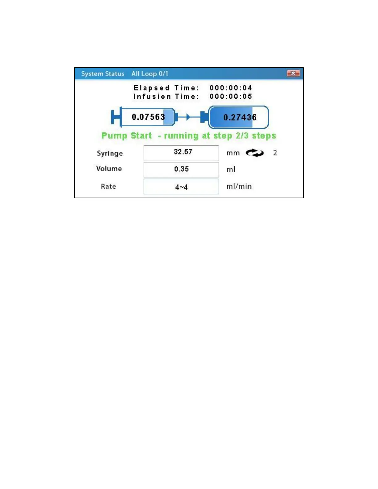 The Syringe, Volume, and Rate fields indicate the parameters that were set for the currently