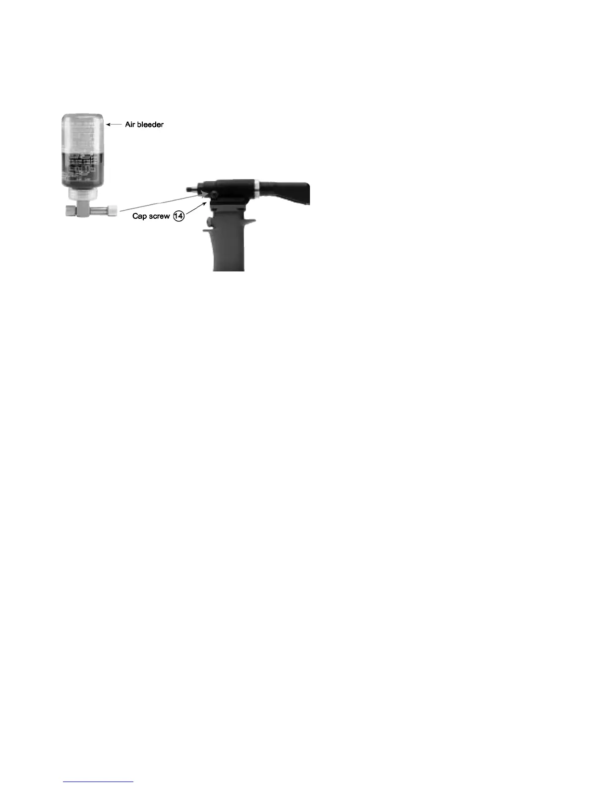 DO NOT depress trigger while disconnecting the air bleeder and replacing the cap screw (14).