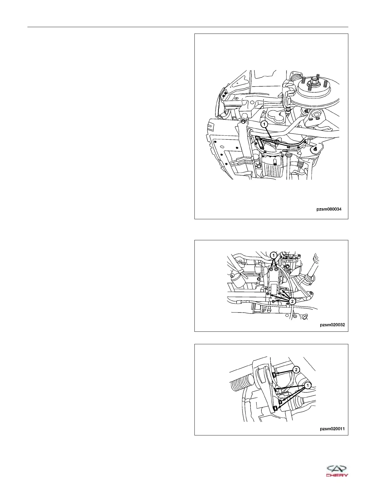 34. Remove the two front engine mount bolts (1) and