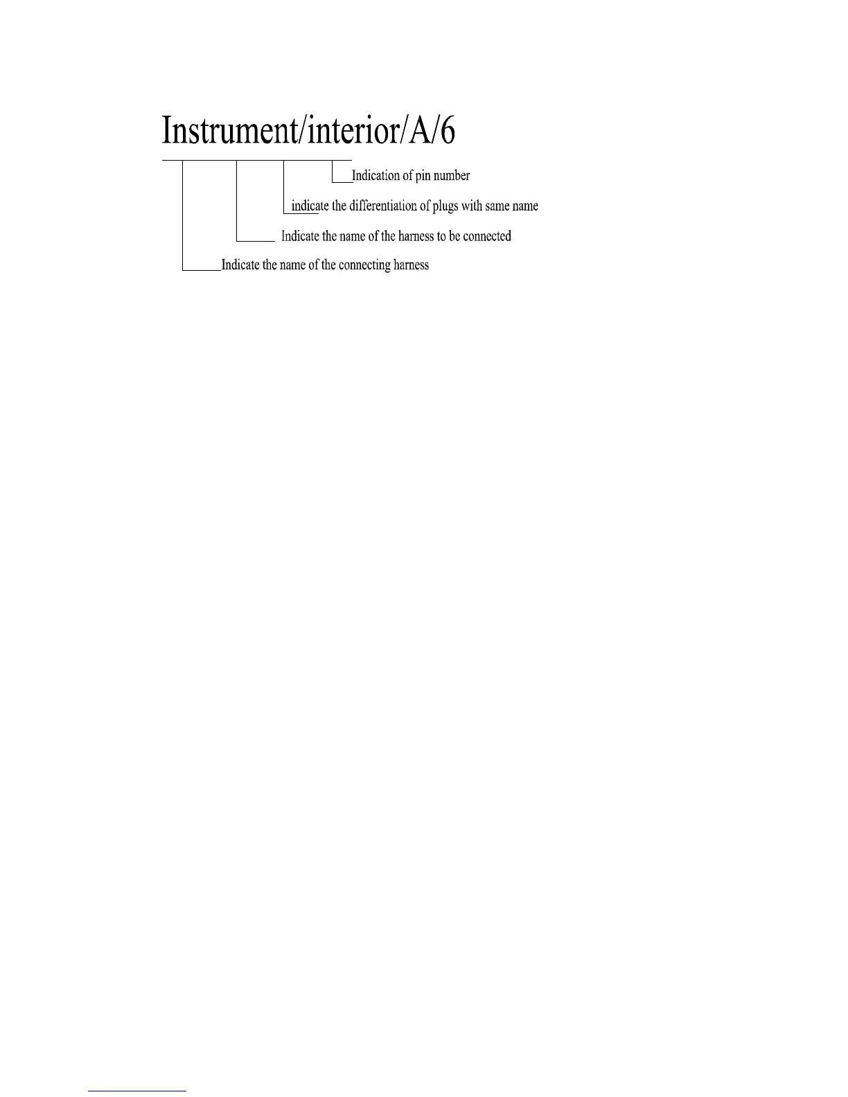 “Instrument/interior/A/6” indicates the #6 pin of plug A of instrument harness and interior harness