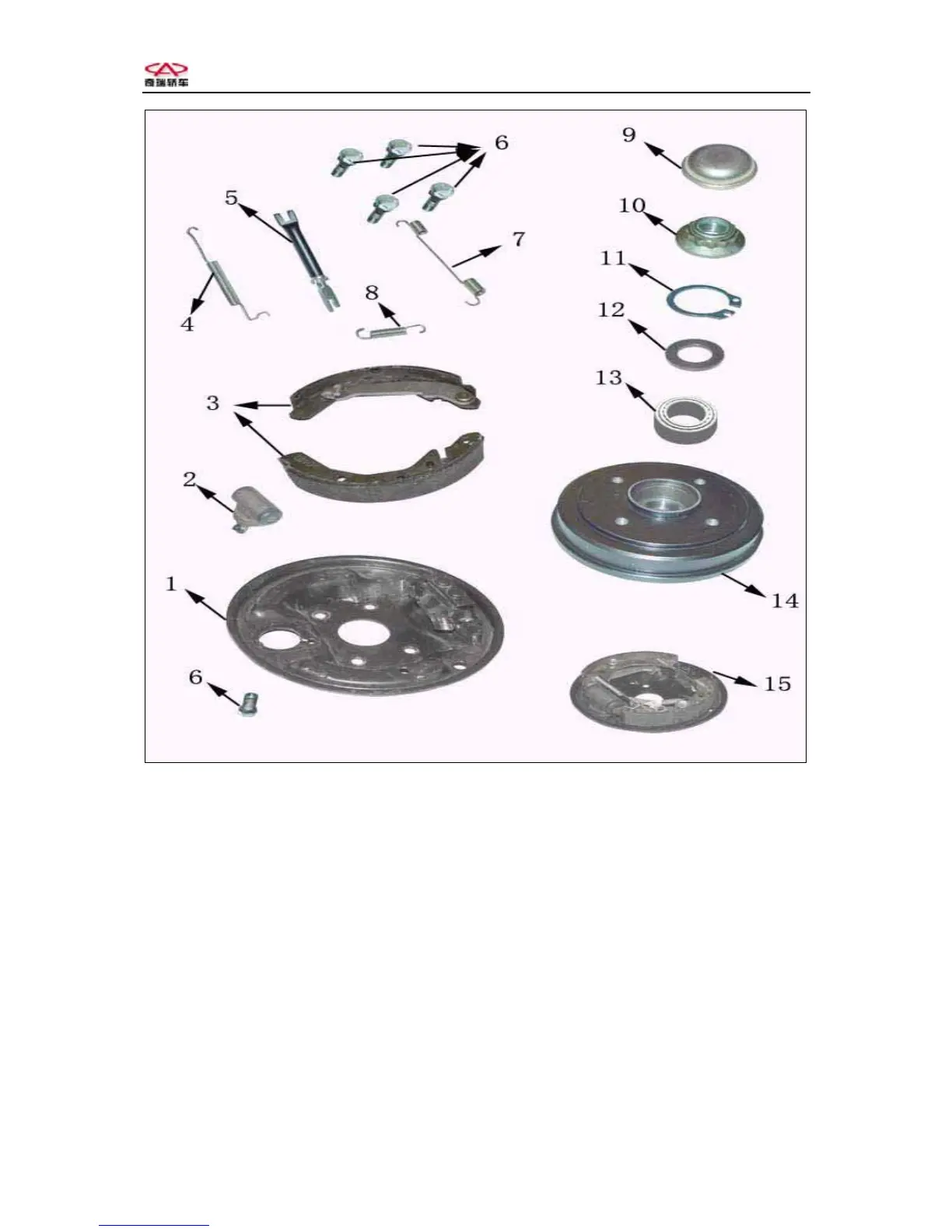 1. Brake base plate; 2. Branch pump; 3. Brake shoe; 4. Upper reset spring of