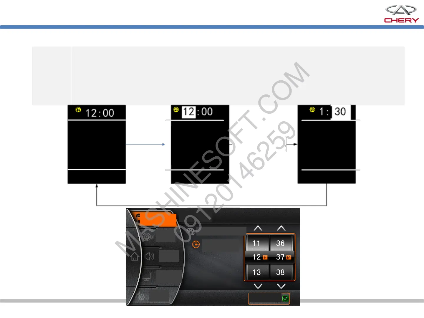 Function: The instrument time can be set by steering wheel button or DVD screen,