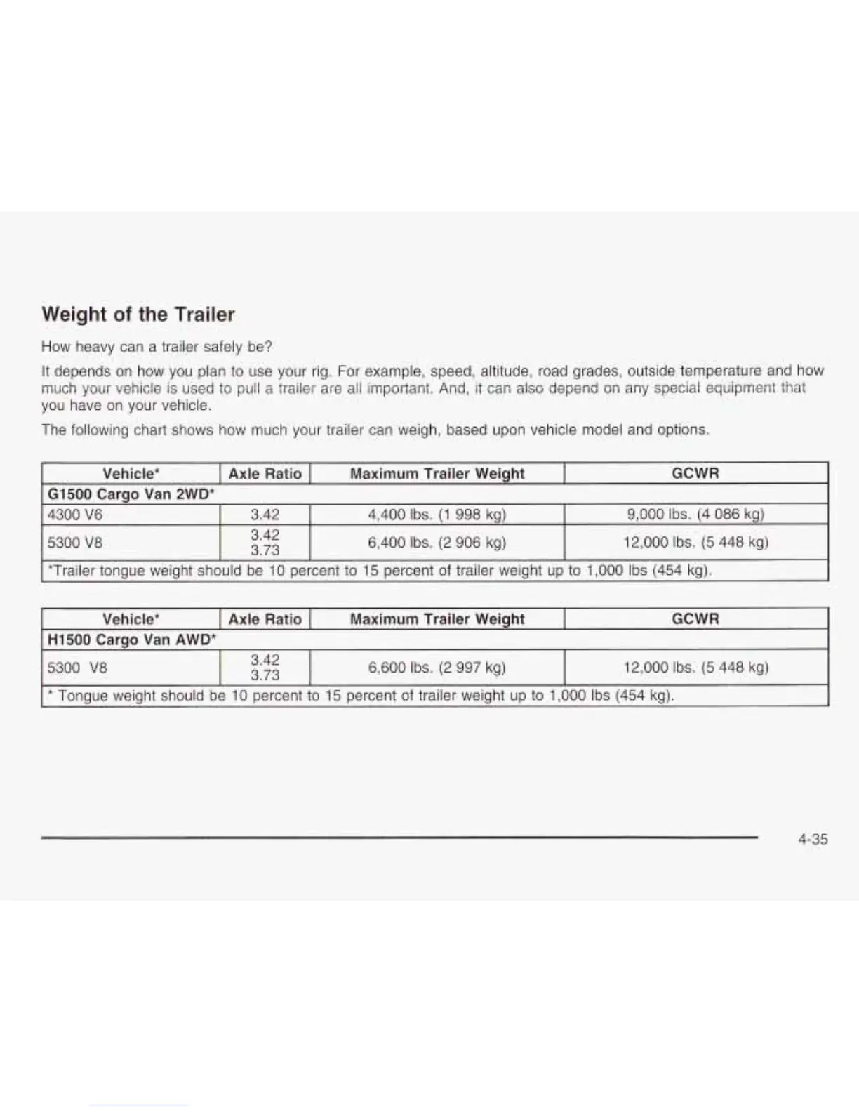 The following chart shows how much your trailer can weigh, based upon vehicle model and options.