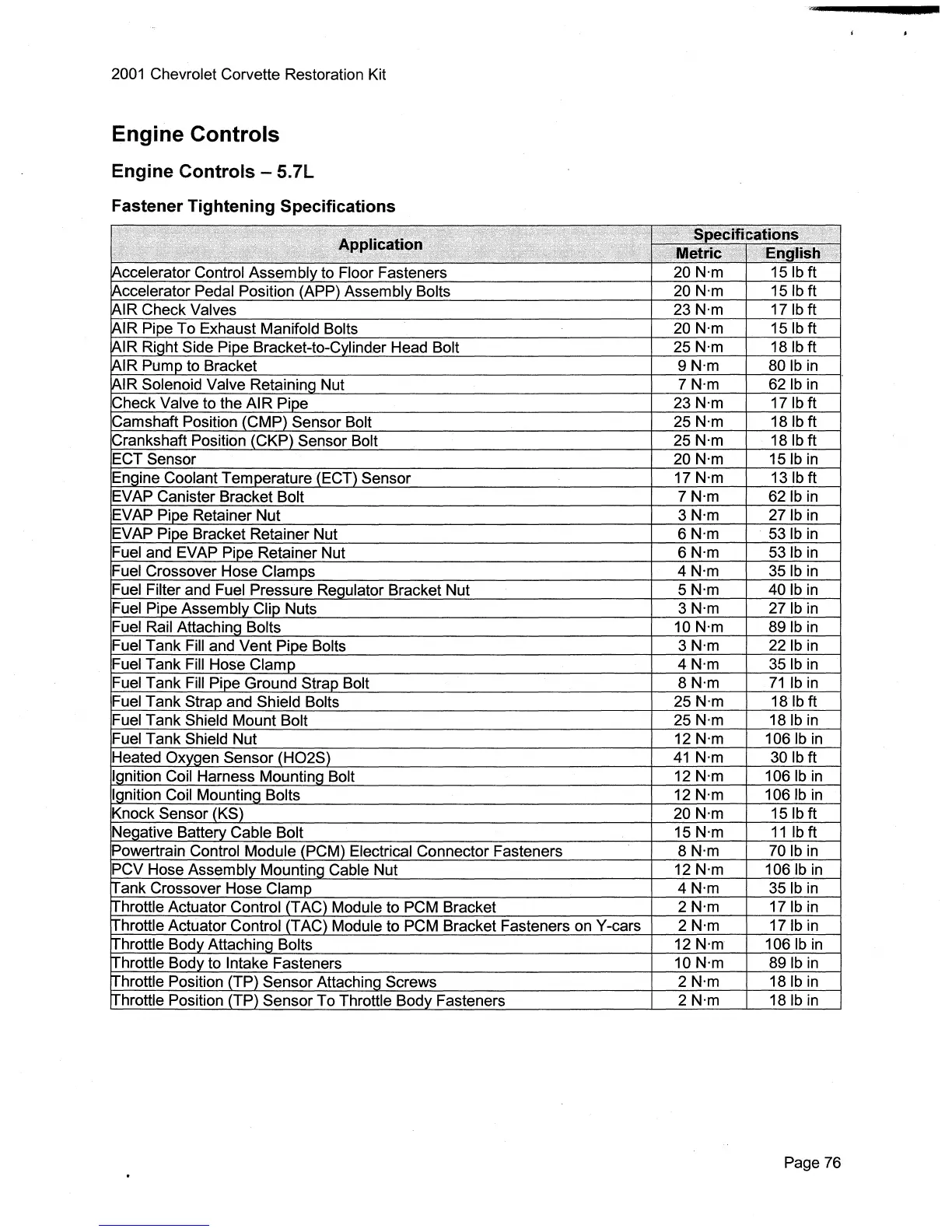 Chevrolet Corvette 2001 - Engine Controls; Engine Controls - 5.7 L; Fastener Tightening Specifications