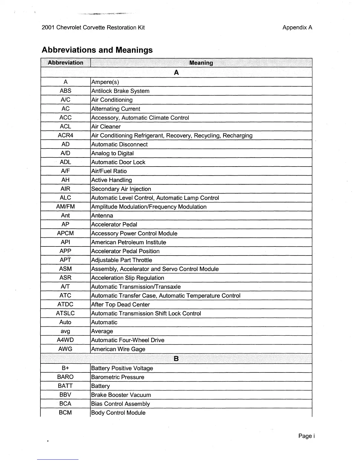 2001 Chevrolet Corvette Restoration Kit Appendix A