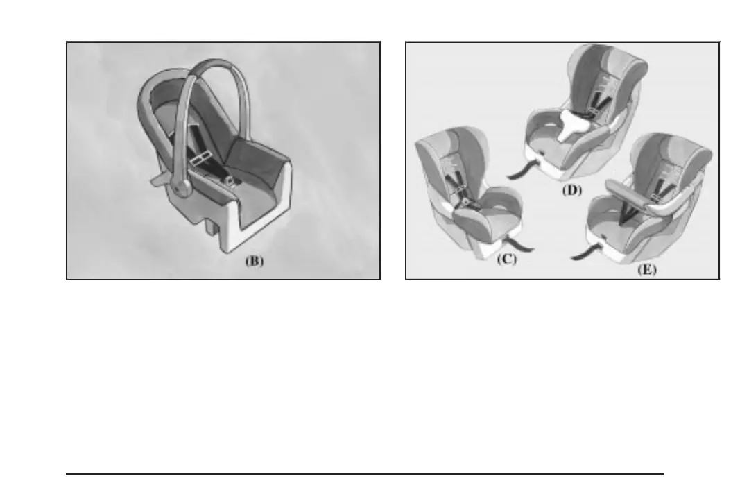 A rear-facing infant seat (B) provides restraint with the