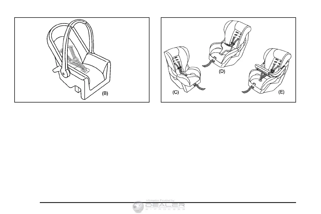 A rear-facing infant seat (B) provides restraint