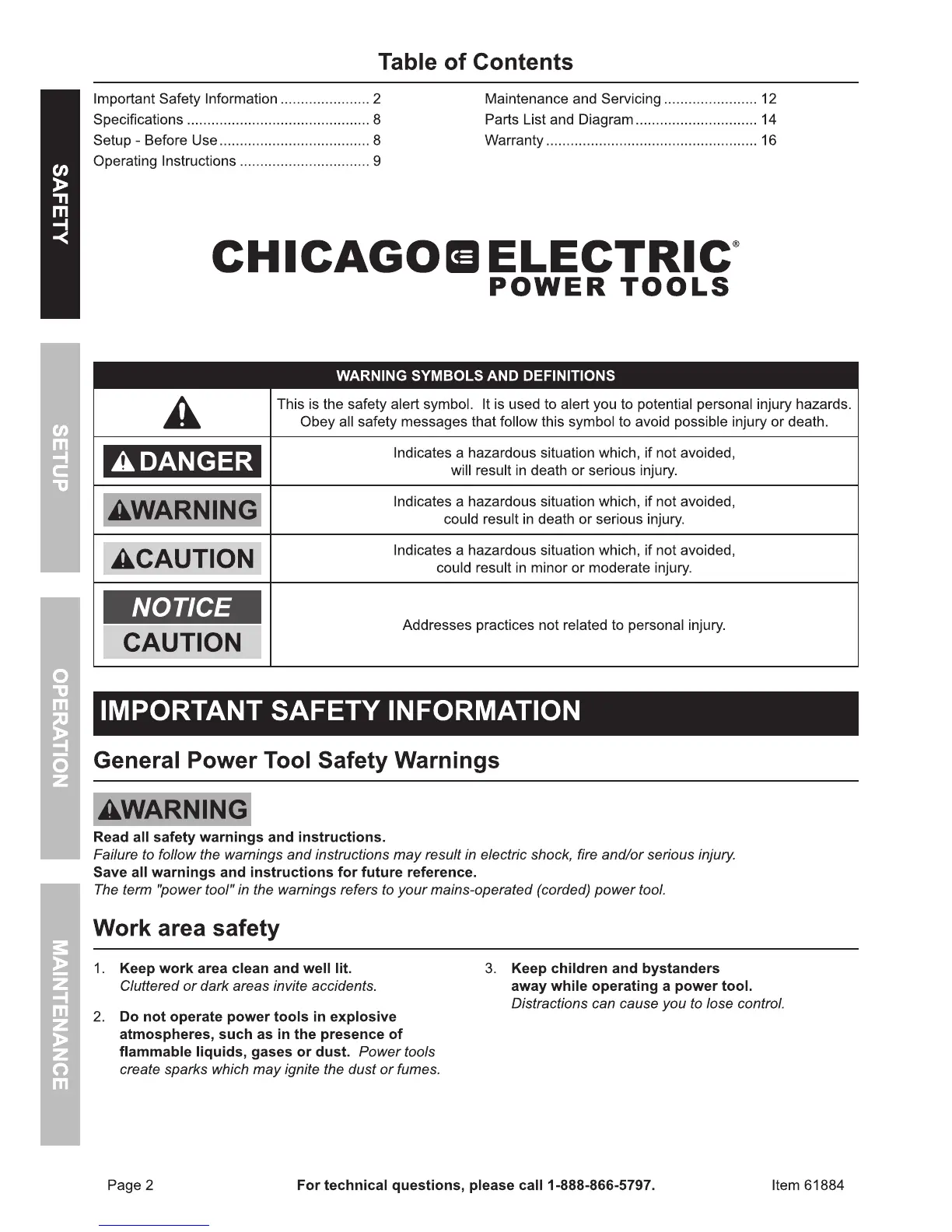 Chicago Electric 61884 - Warning Symbols and Definitions; Safety Alert Symbol Meanings; Important Safety Information; General Power Tool Safety Warnings
