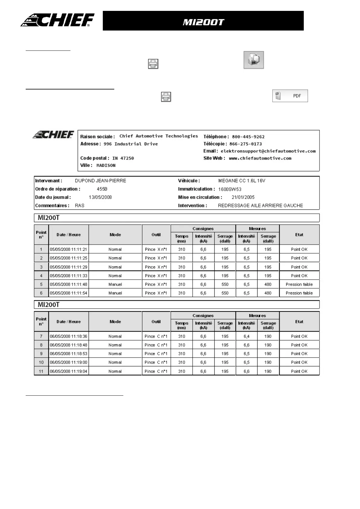 To export the report as a PDF, select a file, and click on . A preview of the print is displayed. Click .