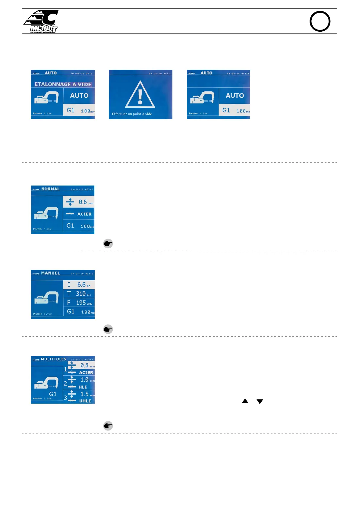 Pour pouvoir utiliser ce mode, eectuer au préalable un point à vide (sans tôles entre les électrodes), comme demandé à l’écran. Presser le bouton