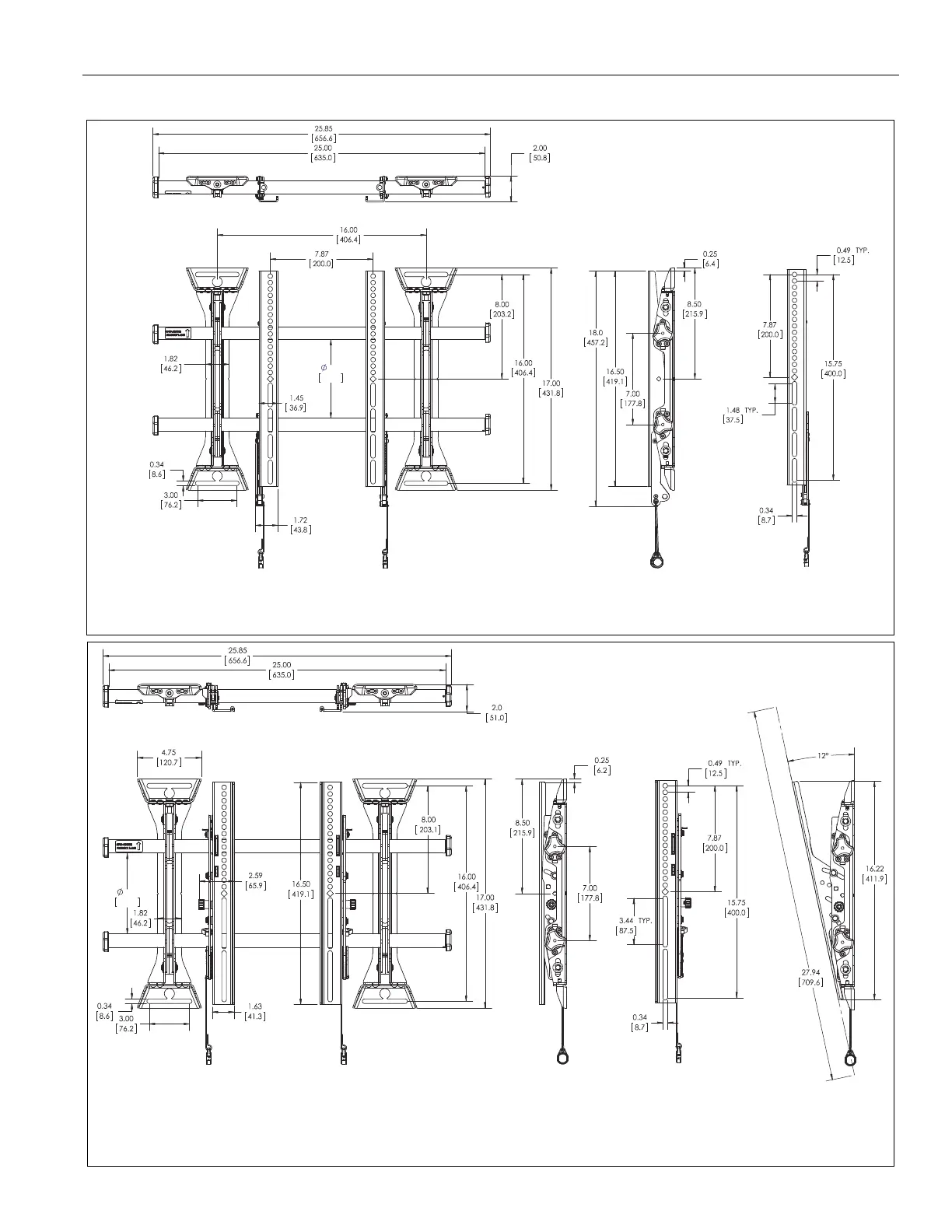 1. MAXIMUM MOUNTING PATTERN IS 22.25" (565 mm) WITHOUT REVERSING UPRIGHTS