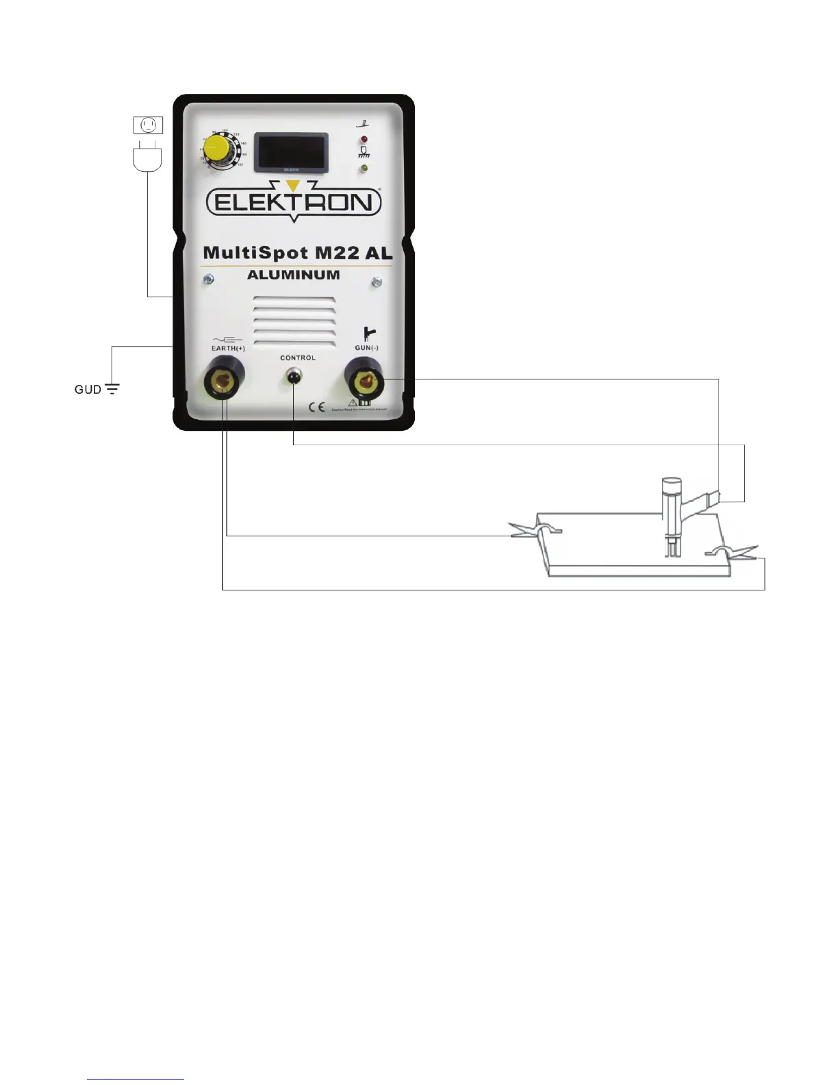 torch cable to “GUN (-)” socket, earth (ground) cable to “STUD EARTH (GROUND) (+)” socket, and turn right for