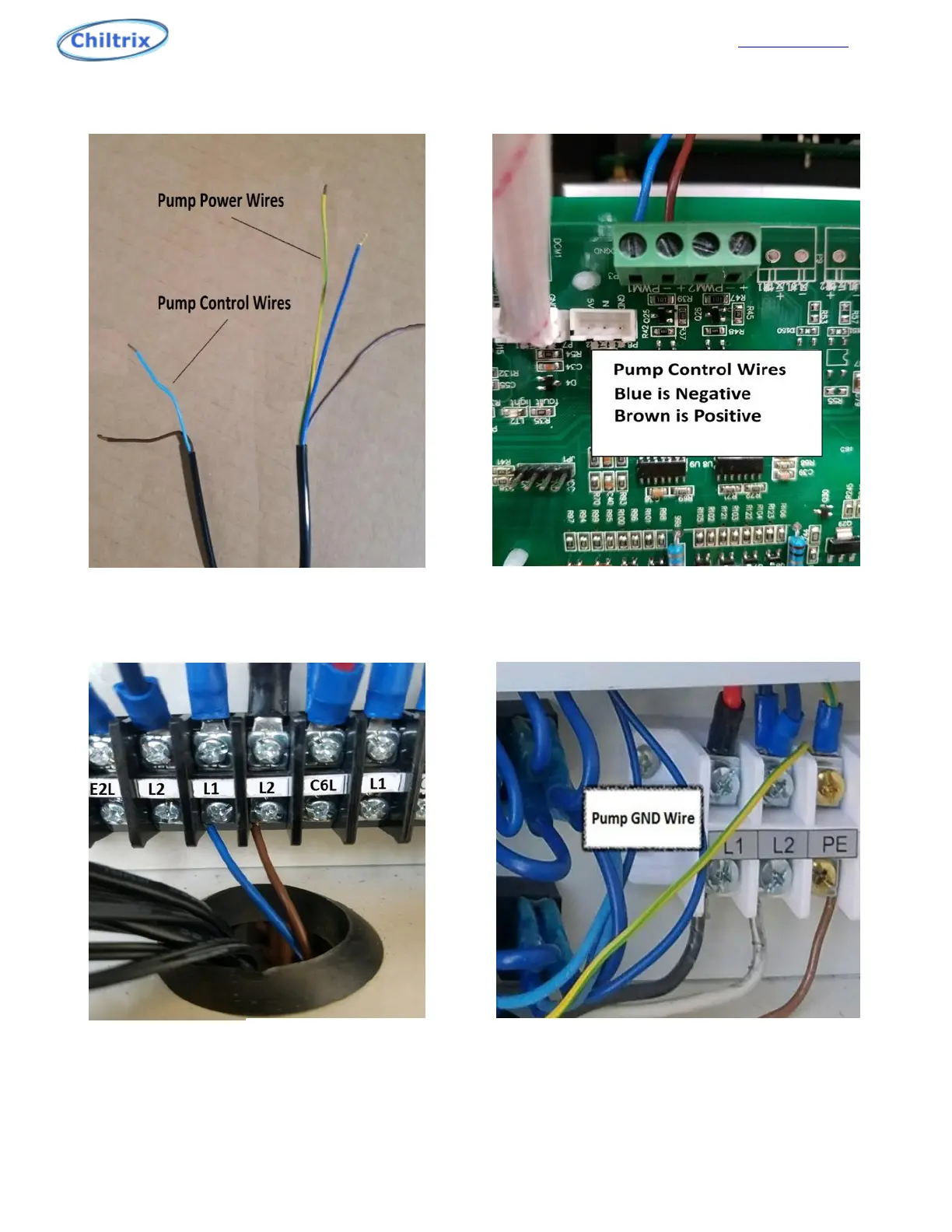 The blue and brown pump CONTROL WIRES are connected to the (+ & -) on