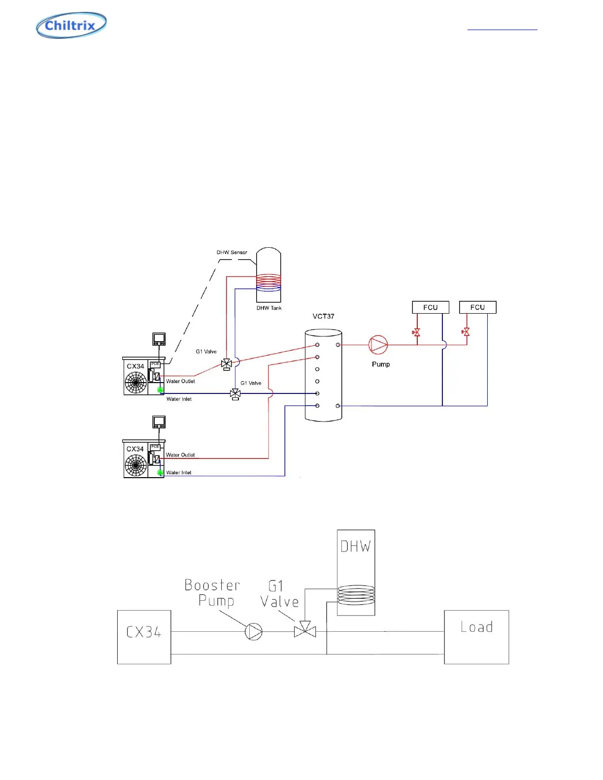DHW load. Bottom drawing shows 1x CX34 properly used with only one G1 valve.
