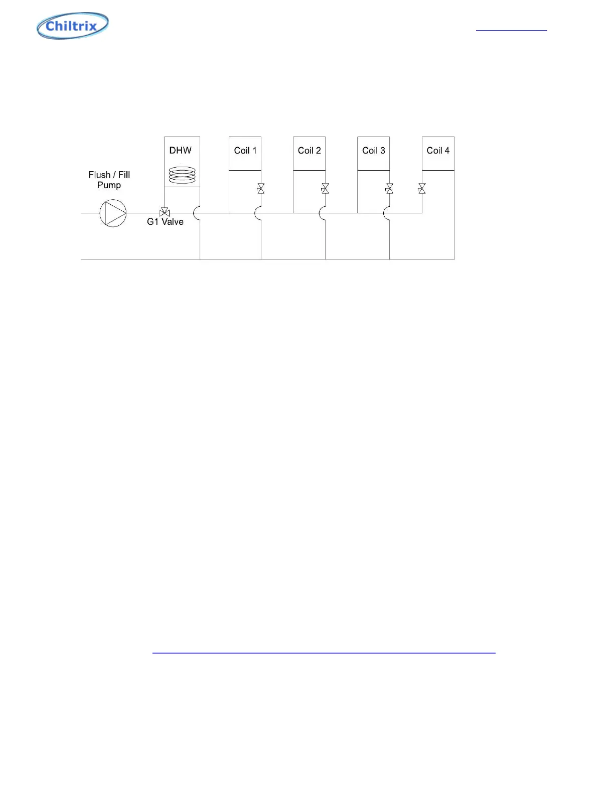 If a DHW tank is installed, it should be the first device on the loop as shown. The G1 valves should