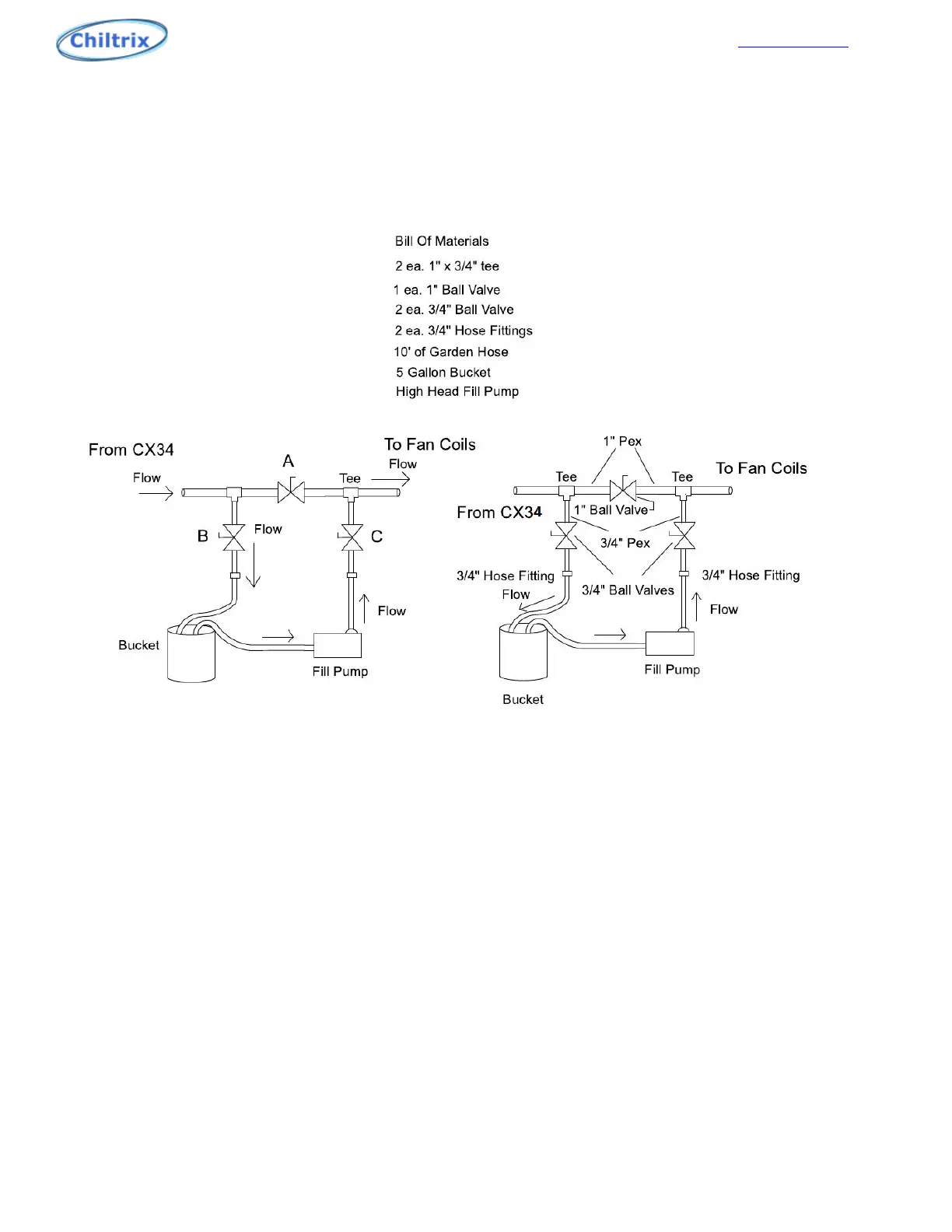 that is closest to the fan coils. Using a third hose, connect it to valve ”B”, closest to the chiller and