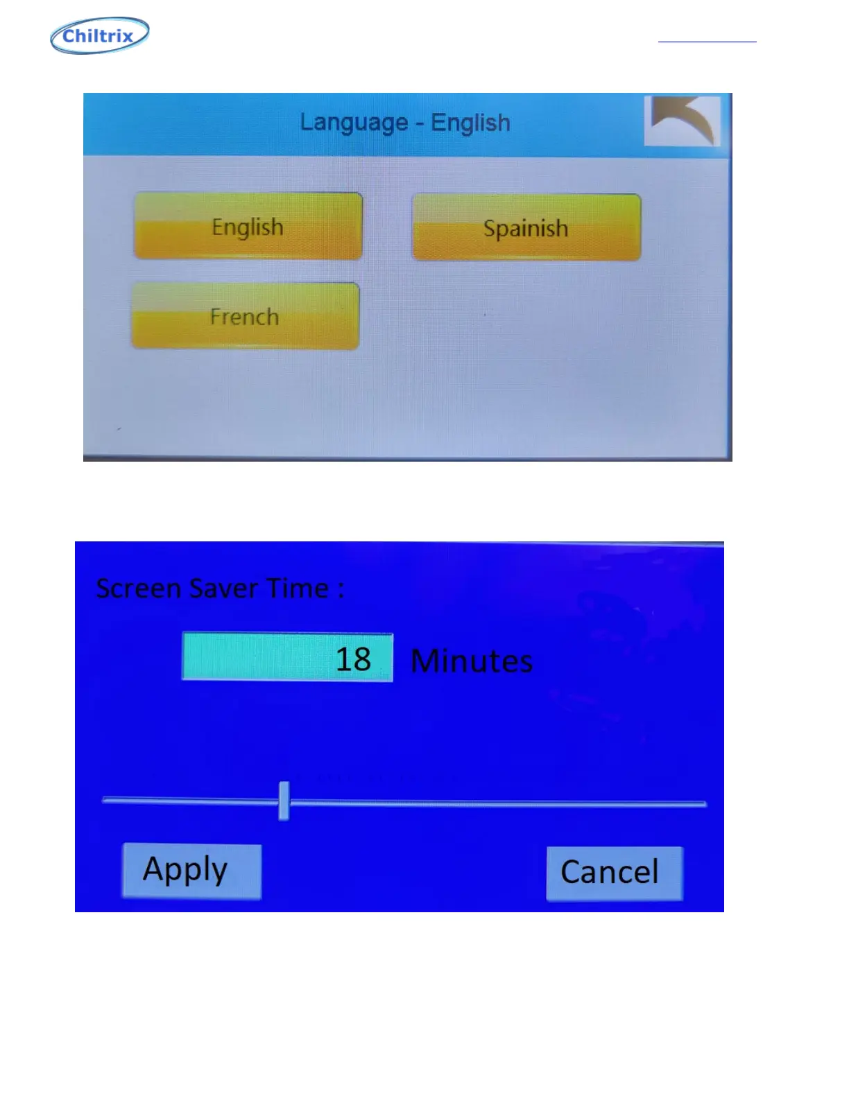 Chiltrix CX50 - System Settings: Language and Screen Saver; Language Selection Screen; Screen Saver Time Configuration
