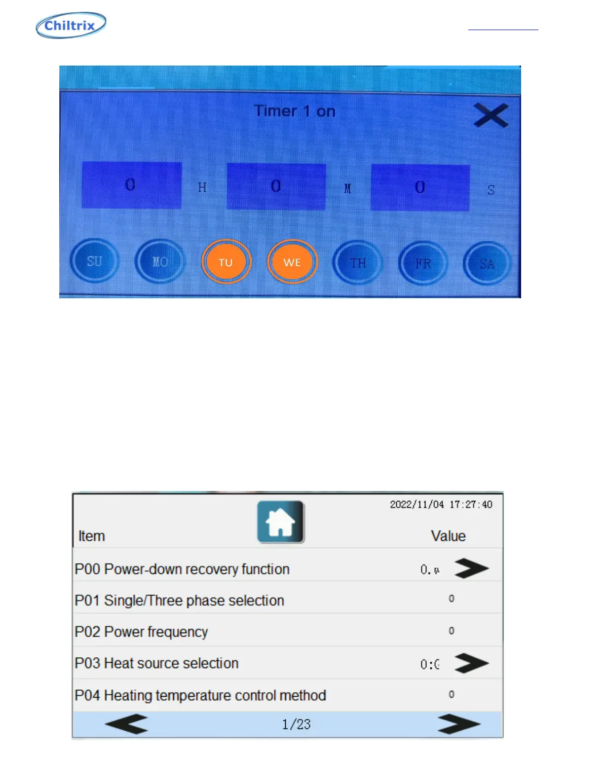 Timer 1 Start time and Days of the week selected (TU and WE),