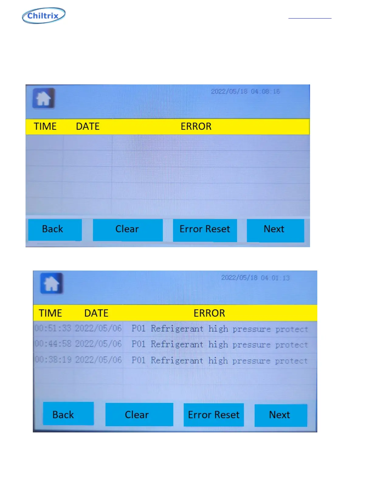 Chiltrix CX50 - Error Log Management; Viewing and Clearing Errors; Sample Error Log Entries