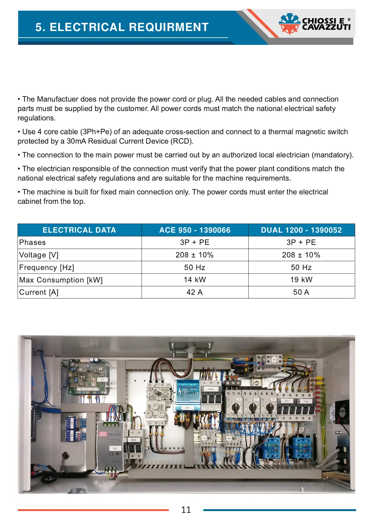 • The machine is built for fixed main connection only. The power cords must enter the electrical