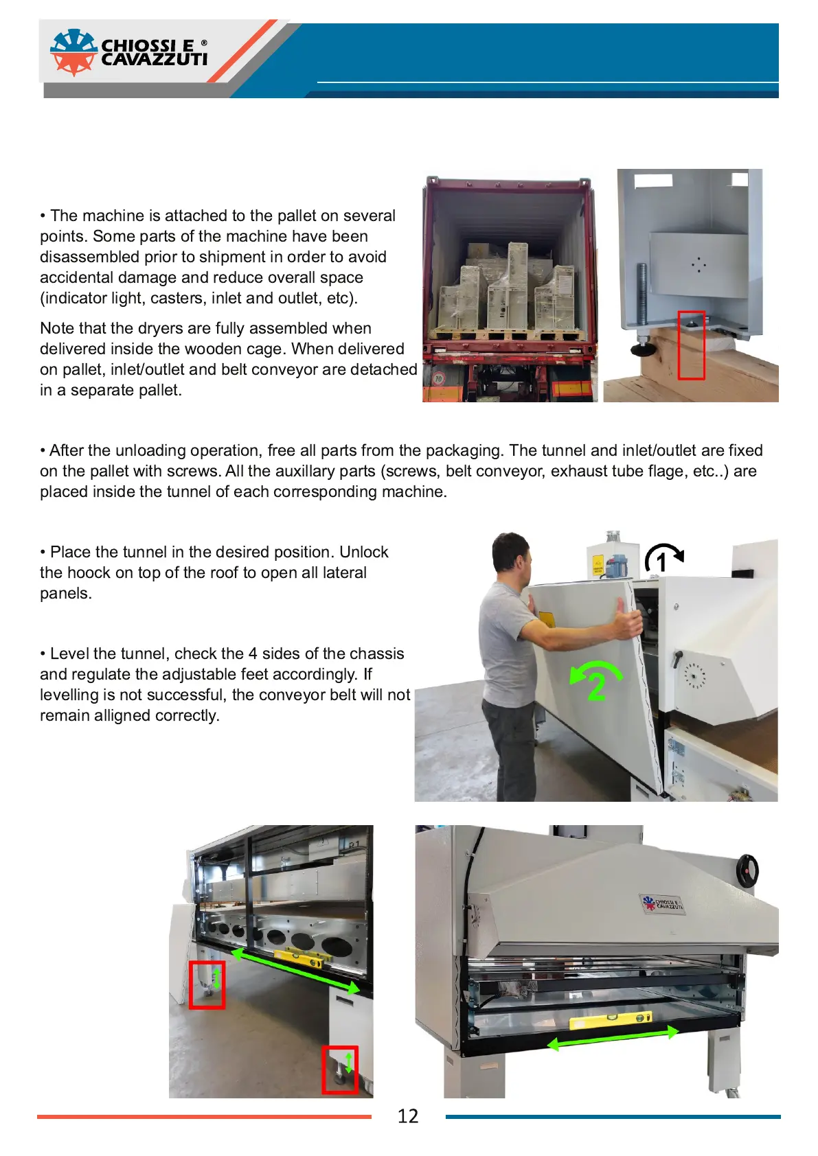 • After the unloading operation, free all parts from the packaging. The tunnel and inlet/outlet are fixed