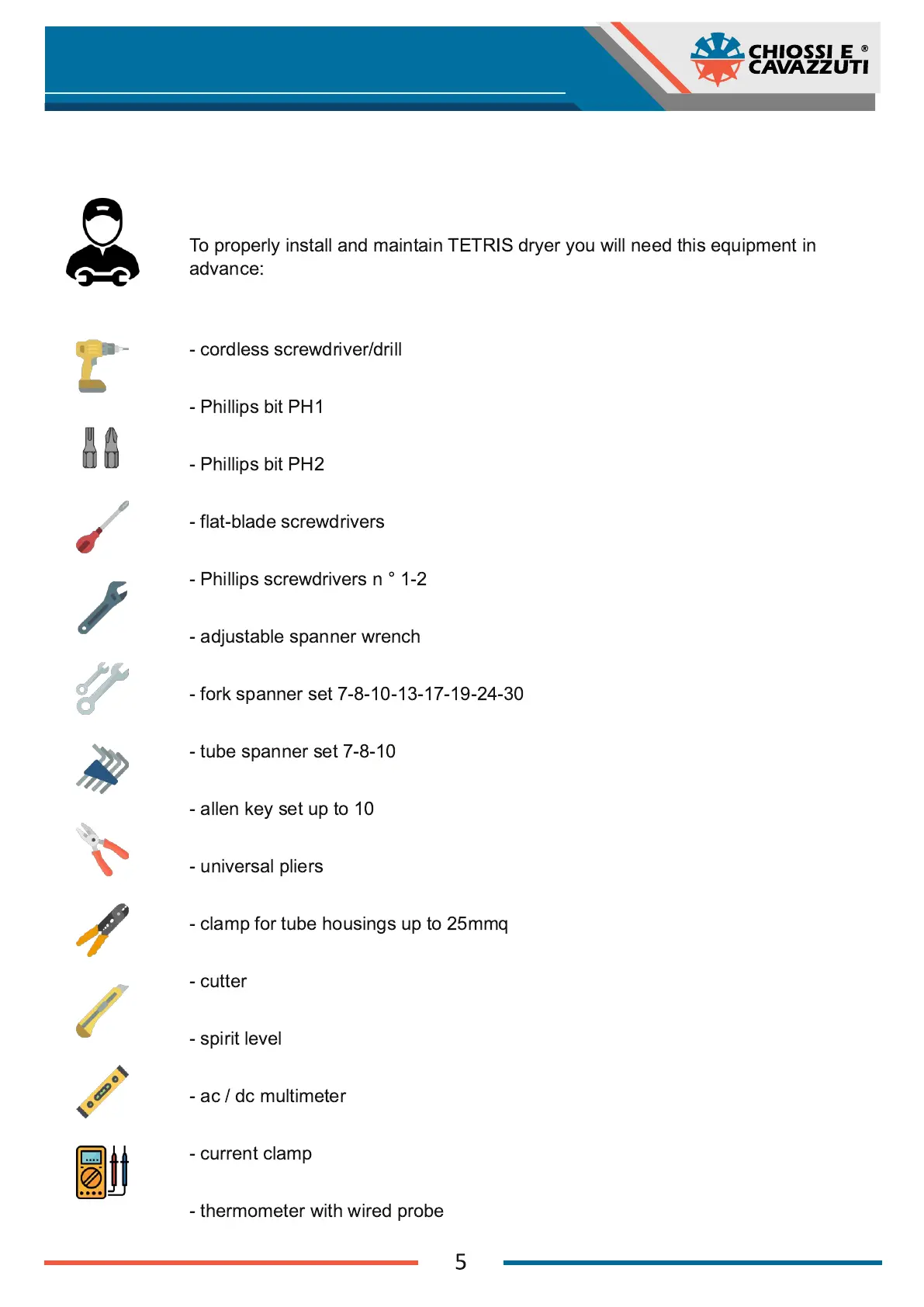 To properly install and maintain TETRIS dryer you will need this equipment in