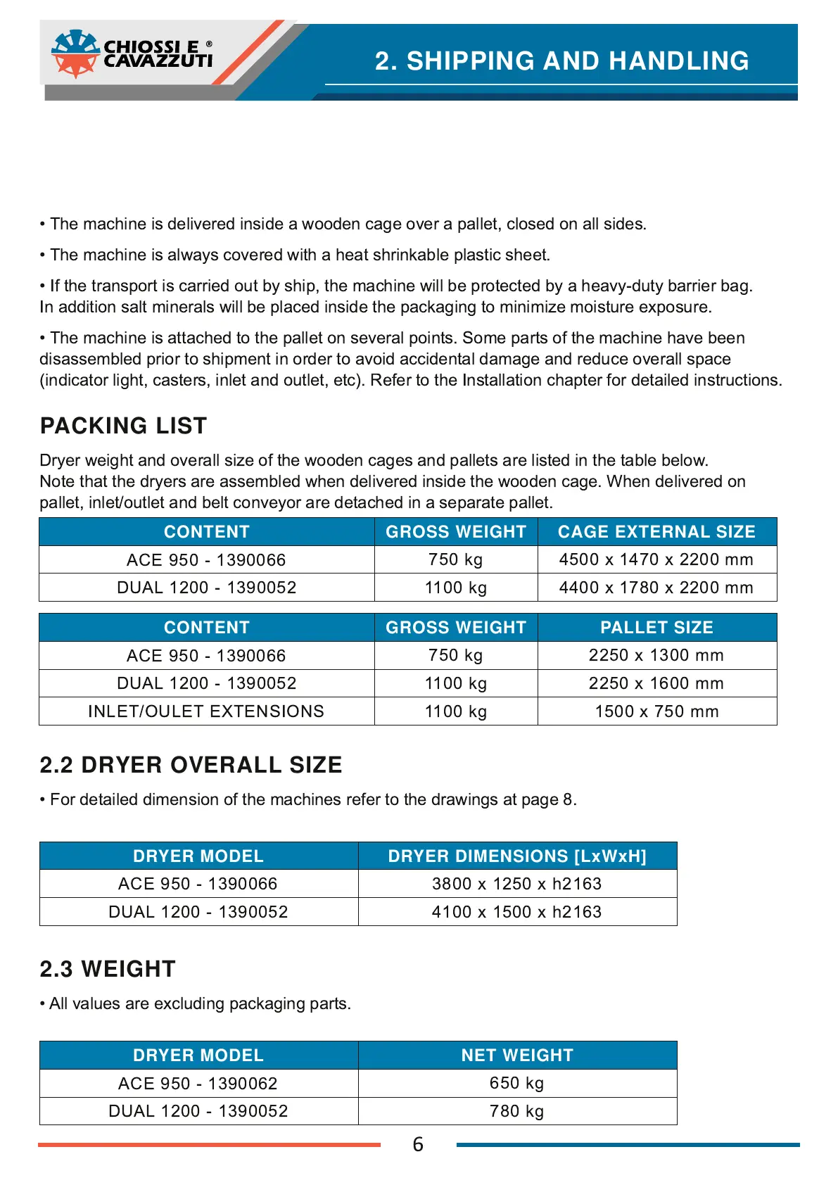 Dryer weight and overall size of the wooden cages and pallets are listed in the table below.