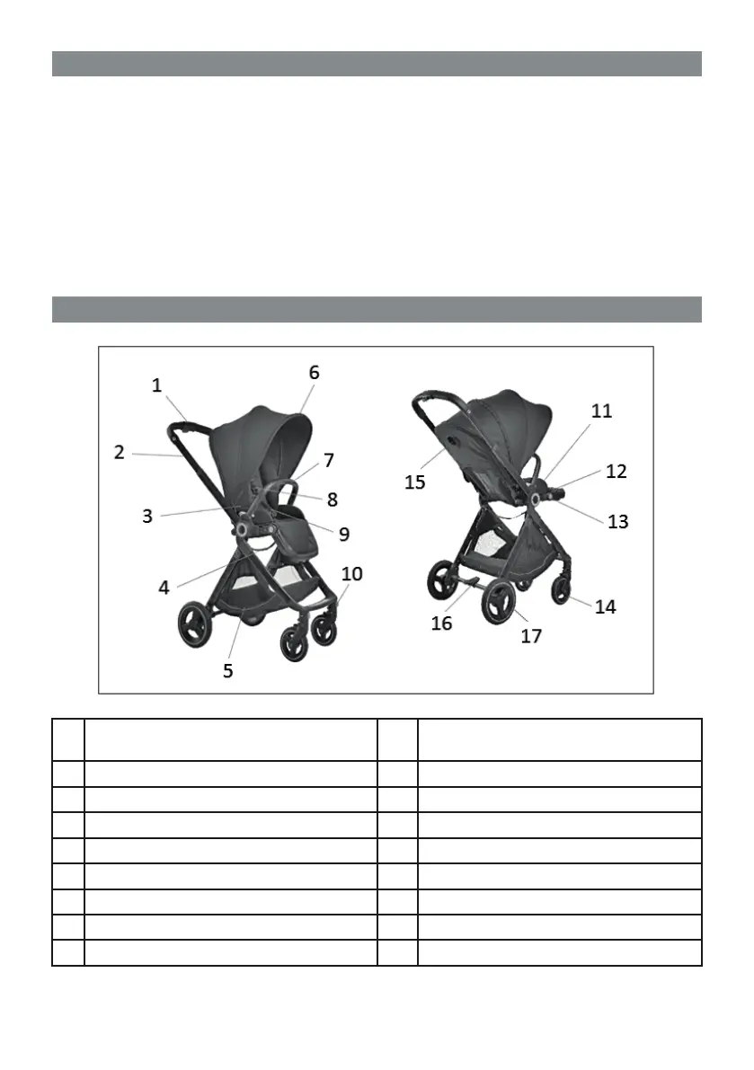 3 Clip to attachment of canopy to frame 12 Leg rest
