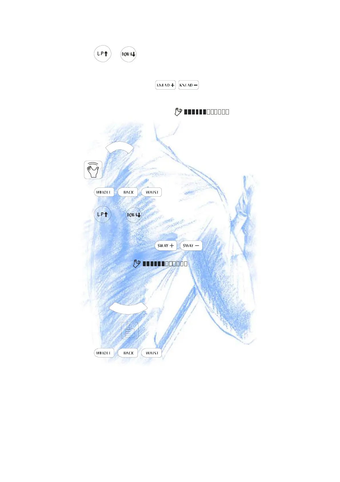 - ●Press or button continuously, the Massage Nods will move up or down.