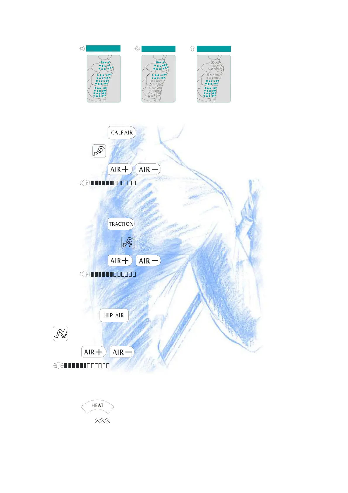 - ●Press the button, it begins to Air Massage on Calf and the corresponding