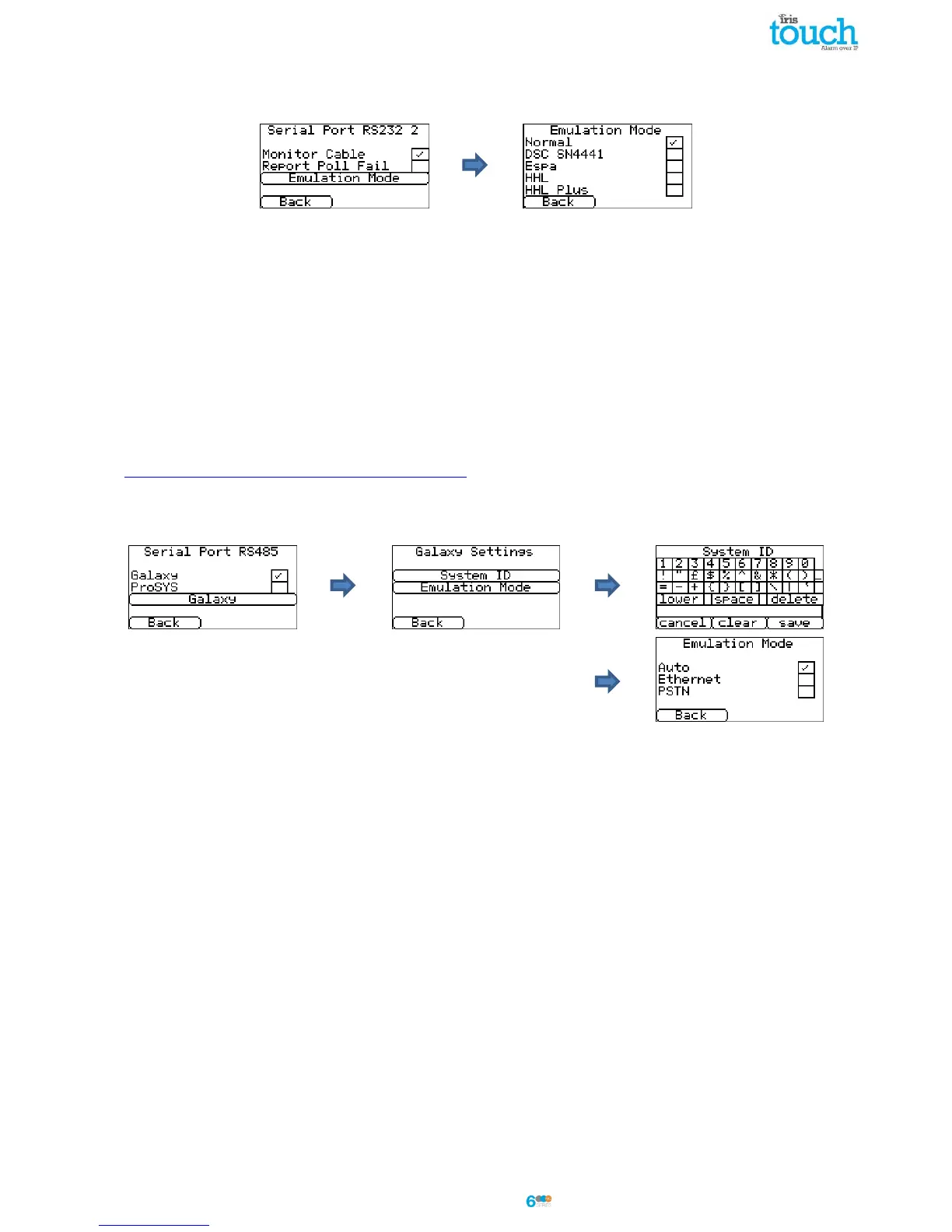 Set the RS485 bus for Honeywell Galaxy mode where the IRIS Touch will simulate one of 3 external modules in