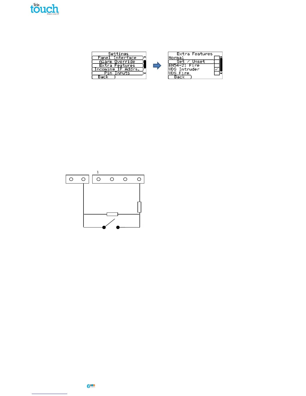 The dialler must be set to the EN54-21 mode which can be done in the Settings>Extra Features as shown below: