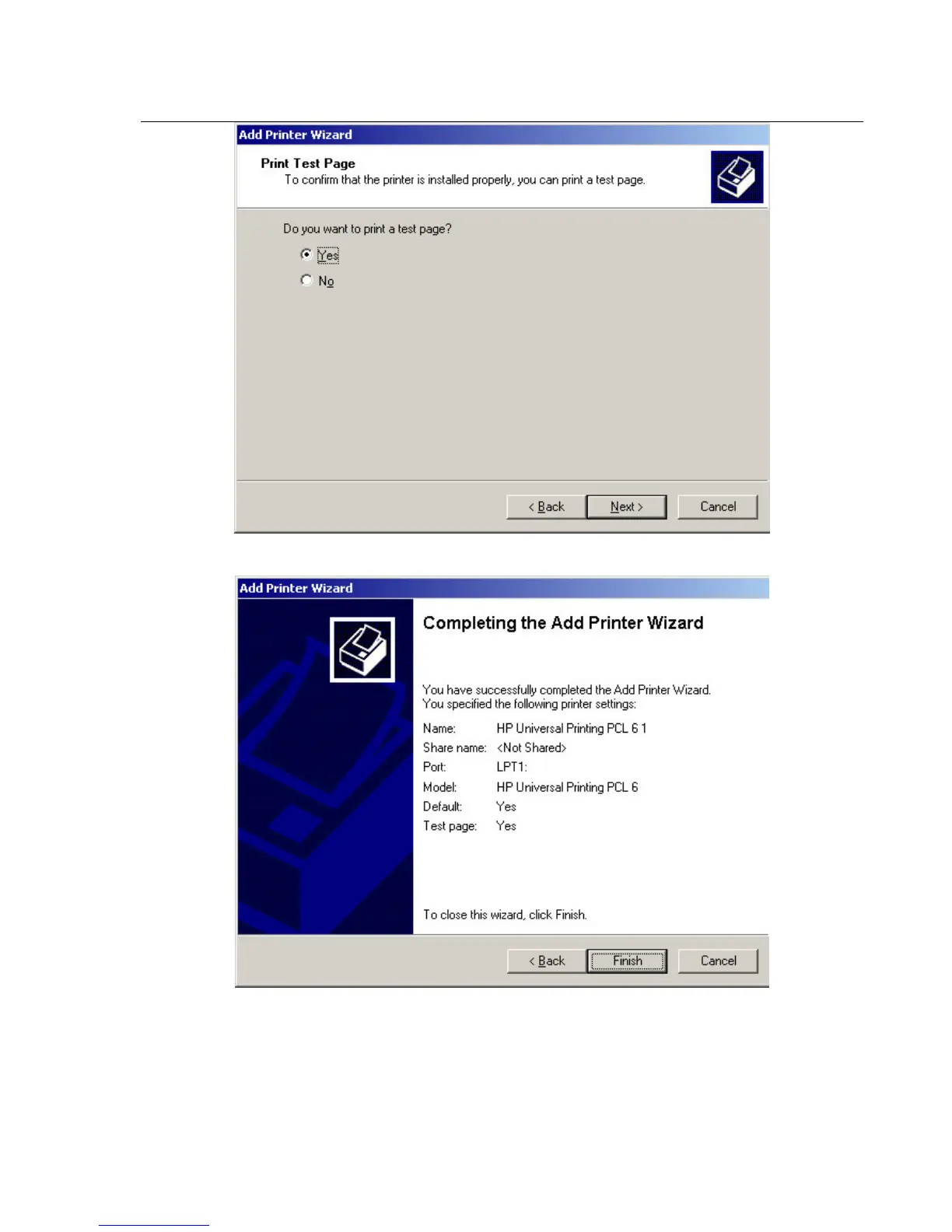 Select “Yes” to print a test page, and click “Next” to continue.