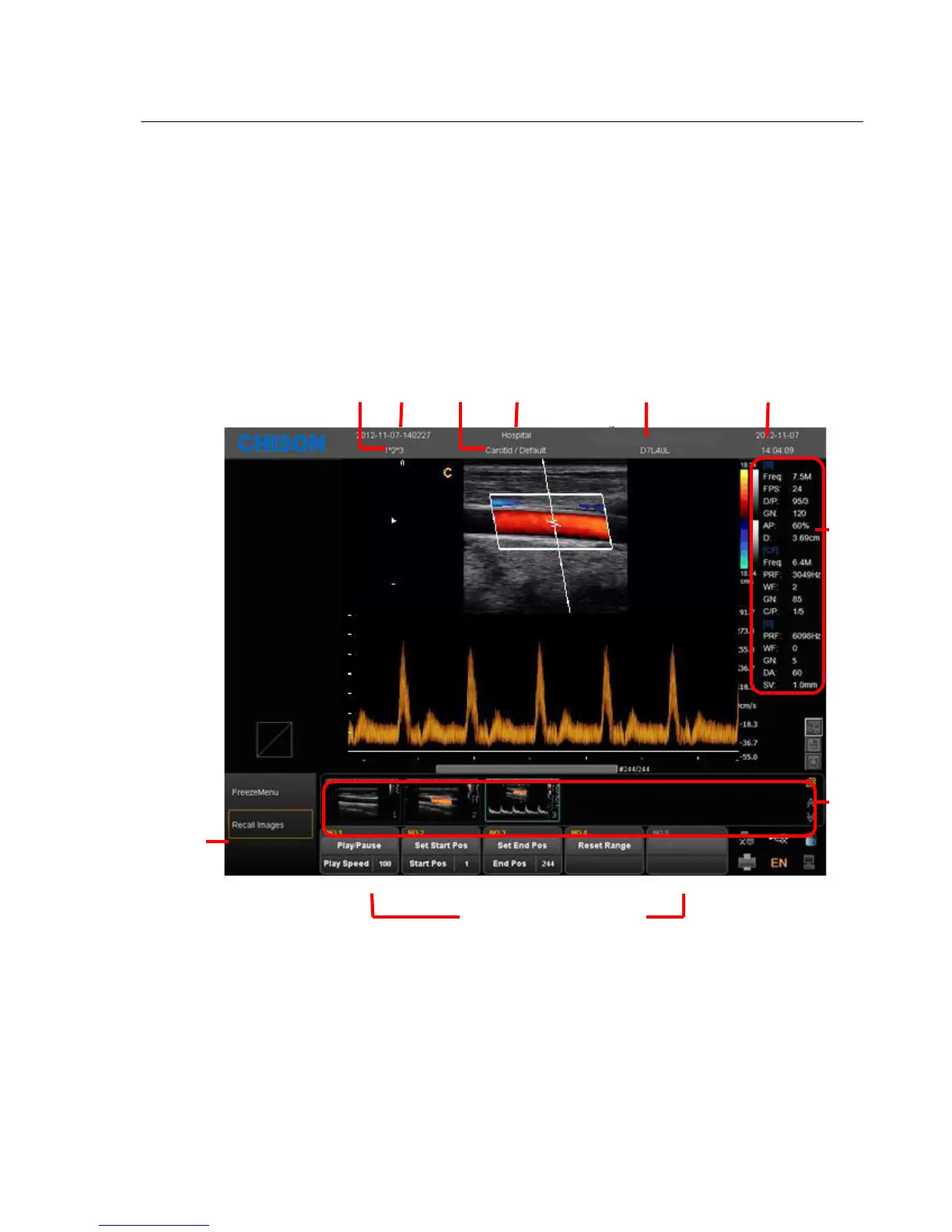 thumbnail area of saving images:This area displays the thumbnail images of current patient. Selecting