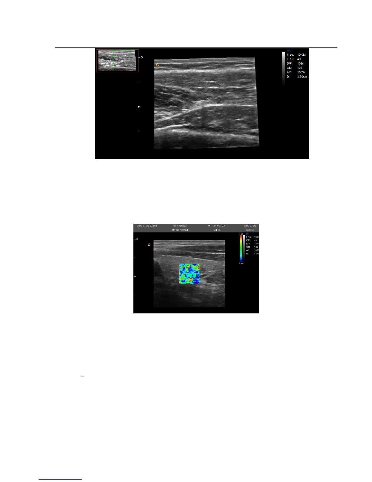 In B mode, turn elastography menu on can enter into elastography mode.