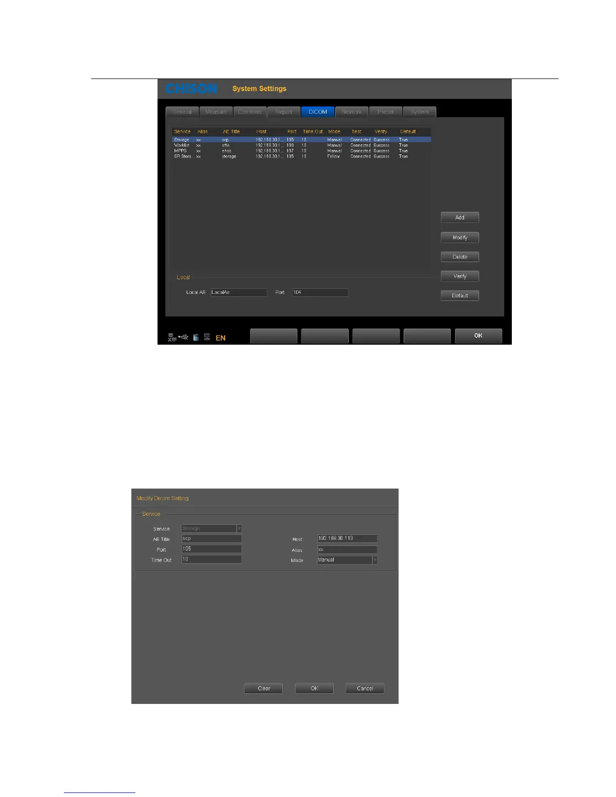 Verify: Select the DICOM link which need to be verified. Press this icon to verify the current DICOM link status.