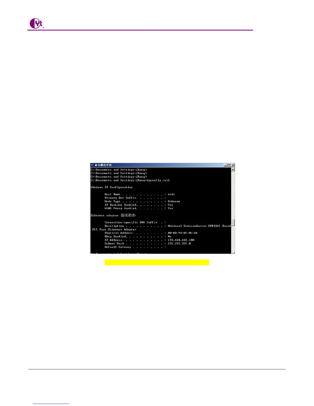 The example in Figure D-1 shows the Ethernet adapter’s IP address as 192.168.168.100. Your computer may
