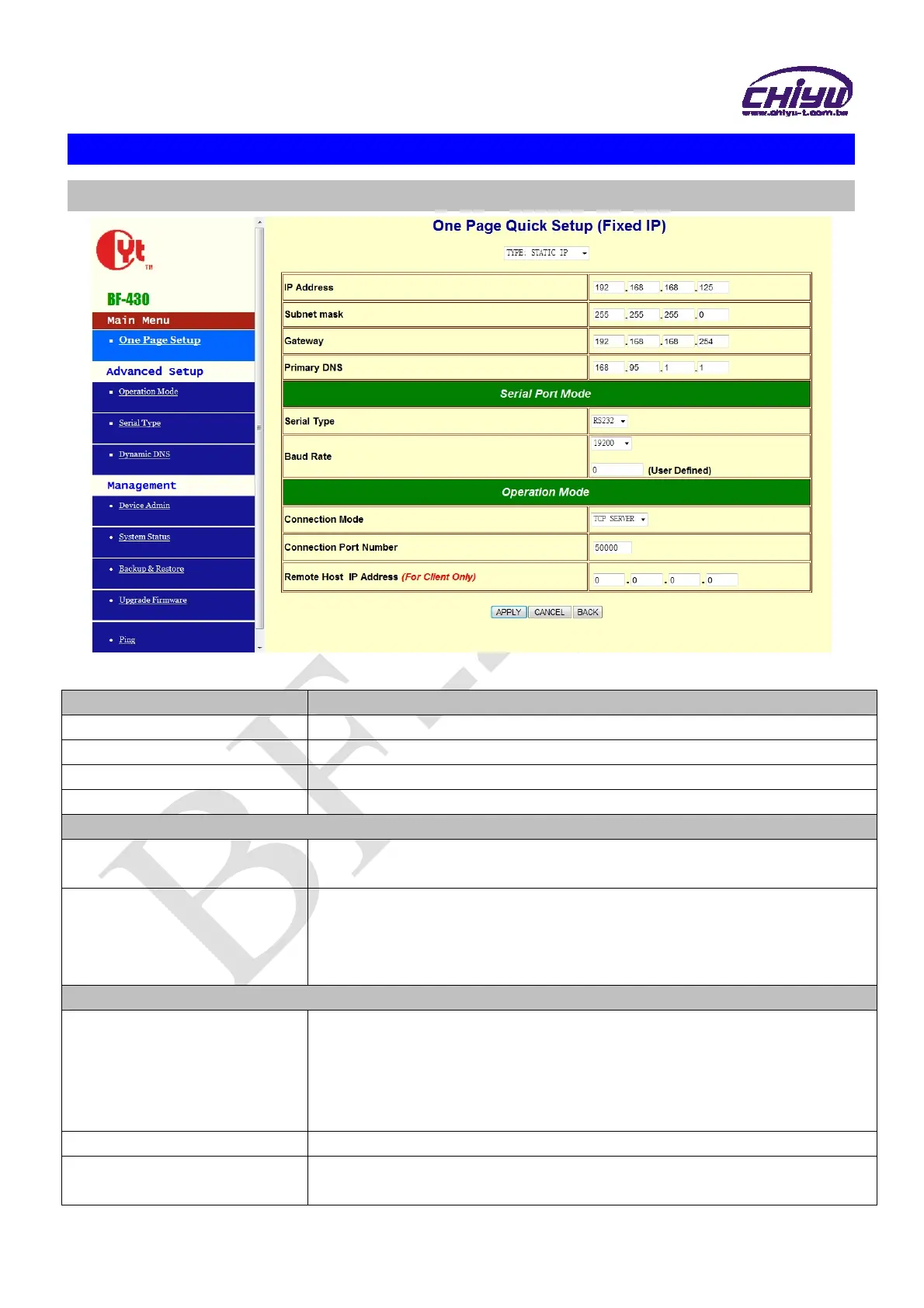 Subnet mask Set the subnet mask of the BF-430,default setting is 255.255.255.0