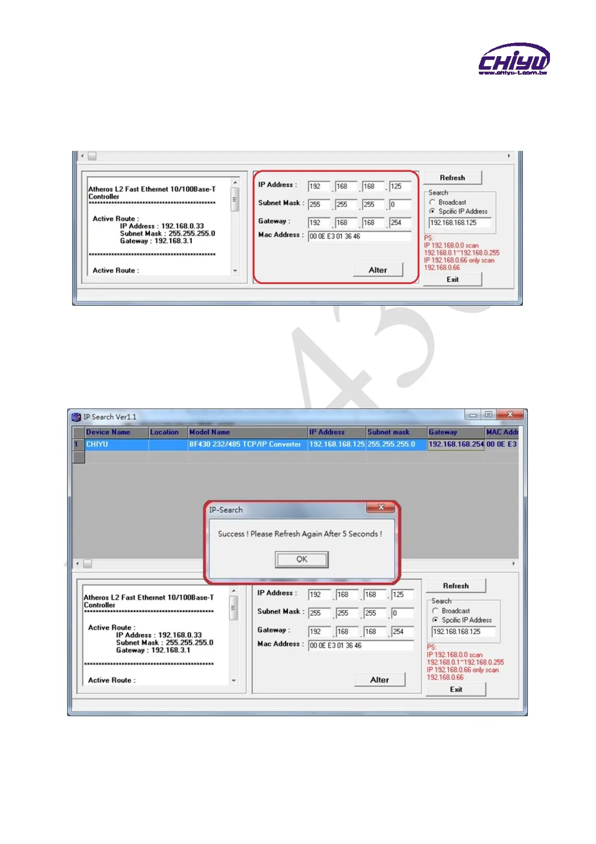 3、While the IP Search window shows up, it will display all BF-430 in LAN, and show its