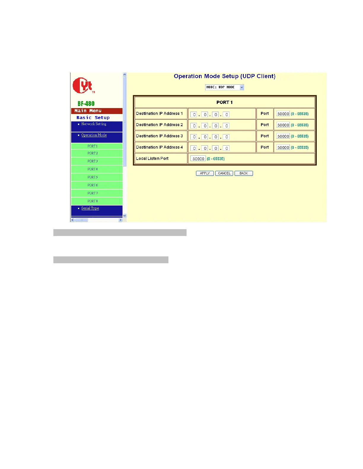 BF-480 allows 4 UDP connections for each COM port; please input each destination IP address