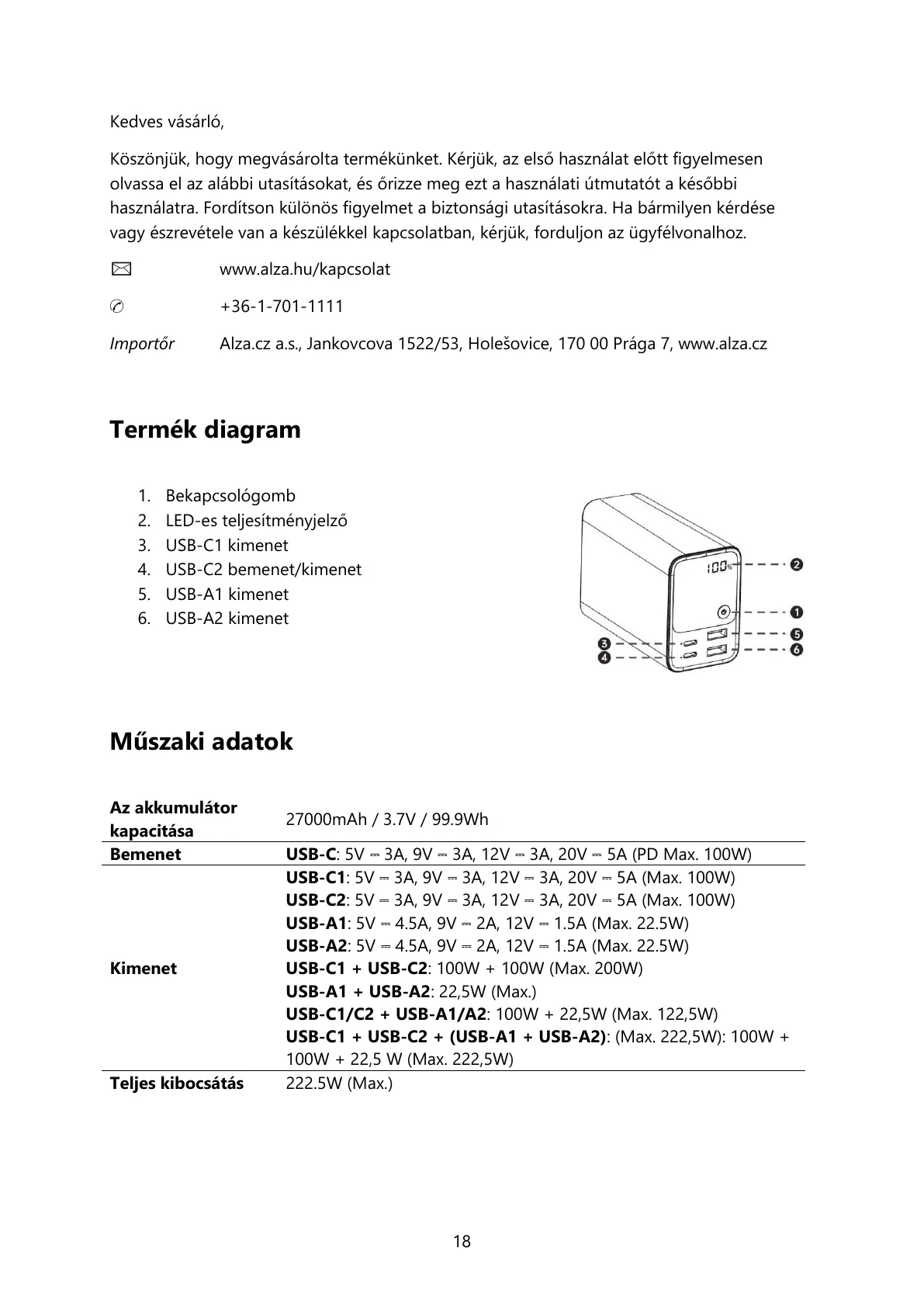 USB-C1: 5V ⎓ 3A, 9V ⎓ 3A, 12V ⎓ 3A, 20V ⎓ 5A (Max. 100W)