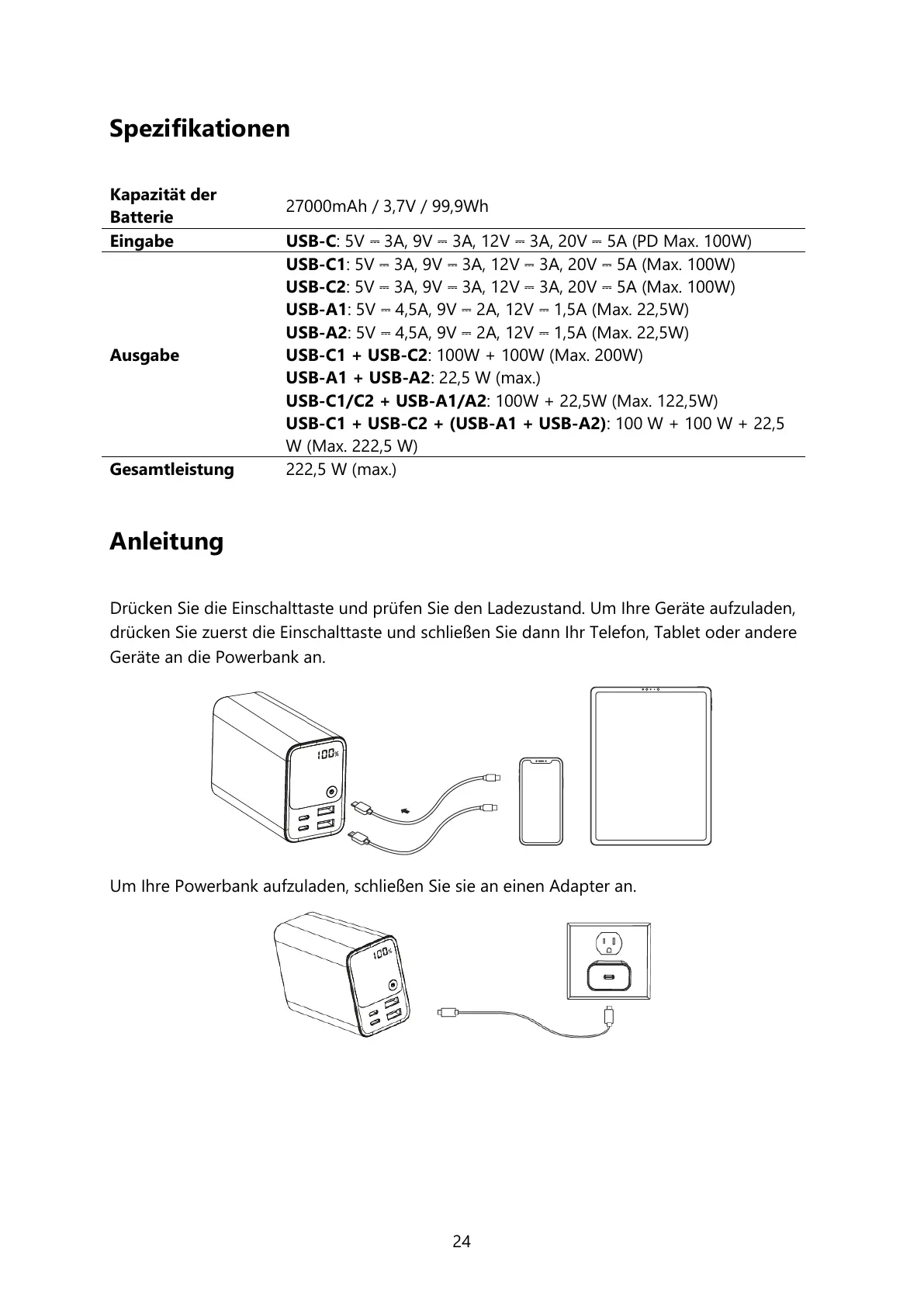 USB-C1/C2 + USB-A1/A2: 100W + 22,5W (Max. 122,5W)