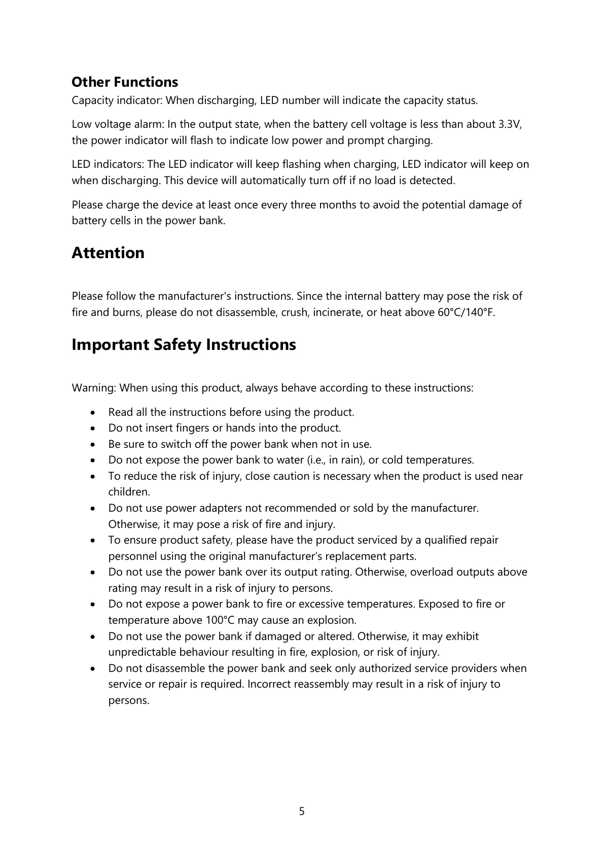 Do not use the power bank over its output rating. Otherwise, overload outputs above
