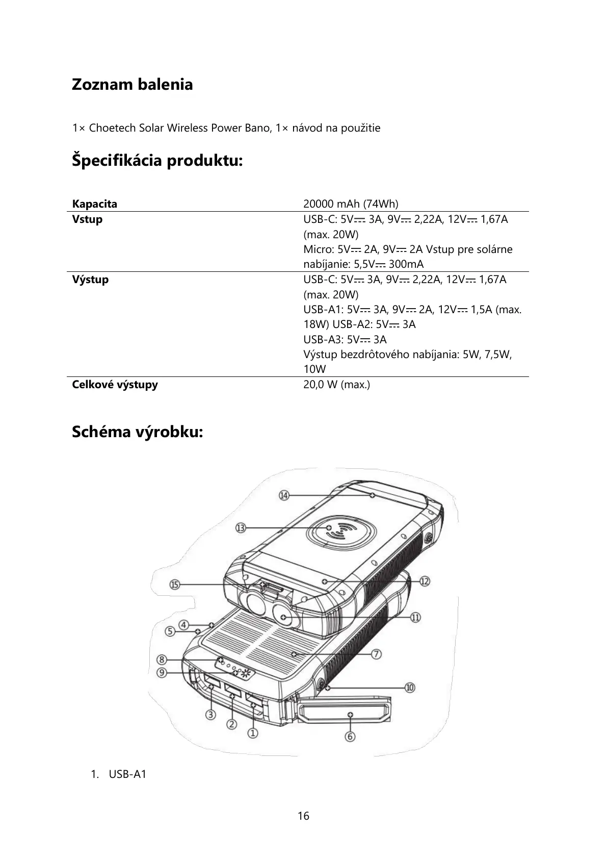 USB-A1: 5V 3A, 9V 2A, 12V 1,5A (max.