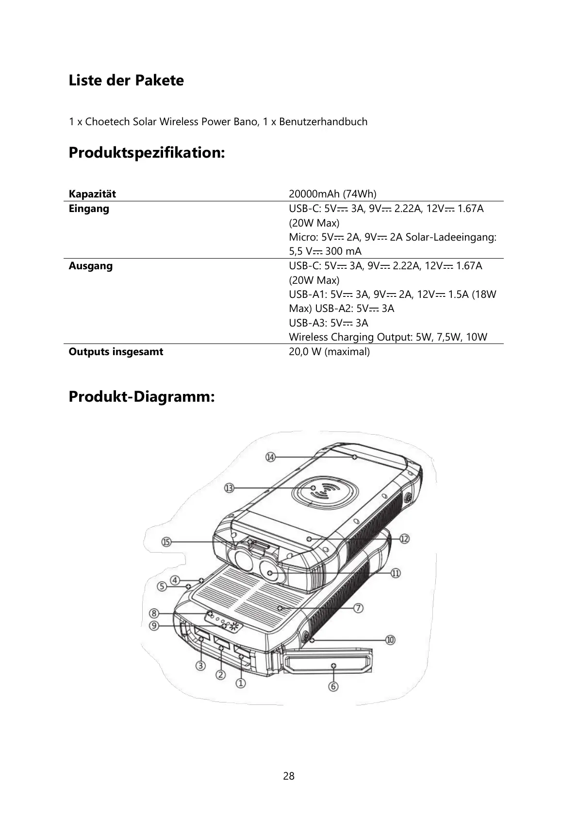 1 x Choetech Solar Wireless Power Bano, 1 x Benutzerhandbuch
