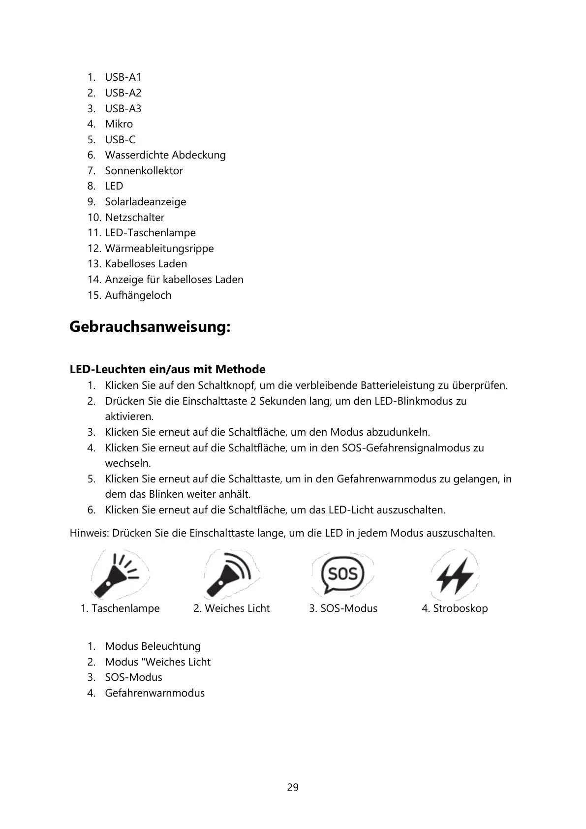 Hinweis: Drücken Sie die Einschalttaste lange, um die LED in jedem Modus auszuschalten.
