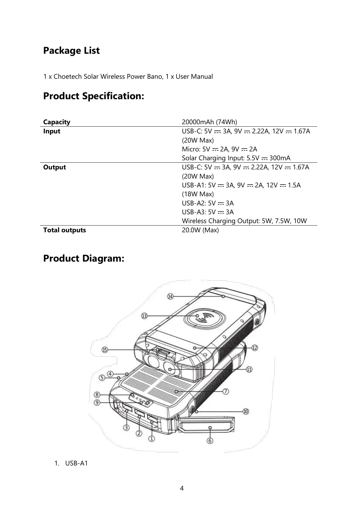 USB-A1: 5V 3A, 9V 2A, 12V 1.5A