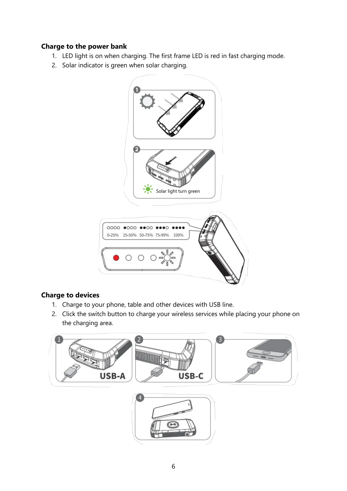 1. LED light is on when charging. The first frame LED is red in fast charging mode.