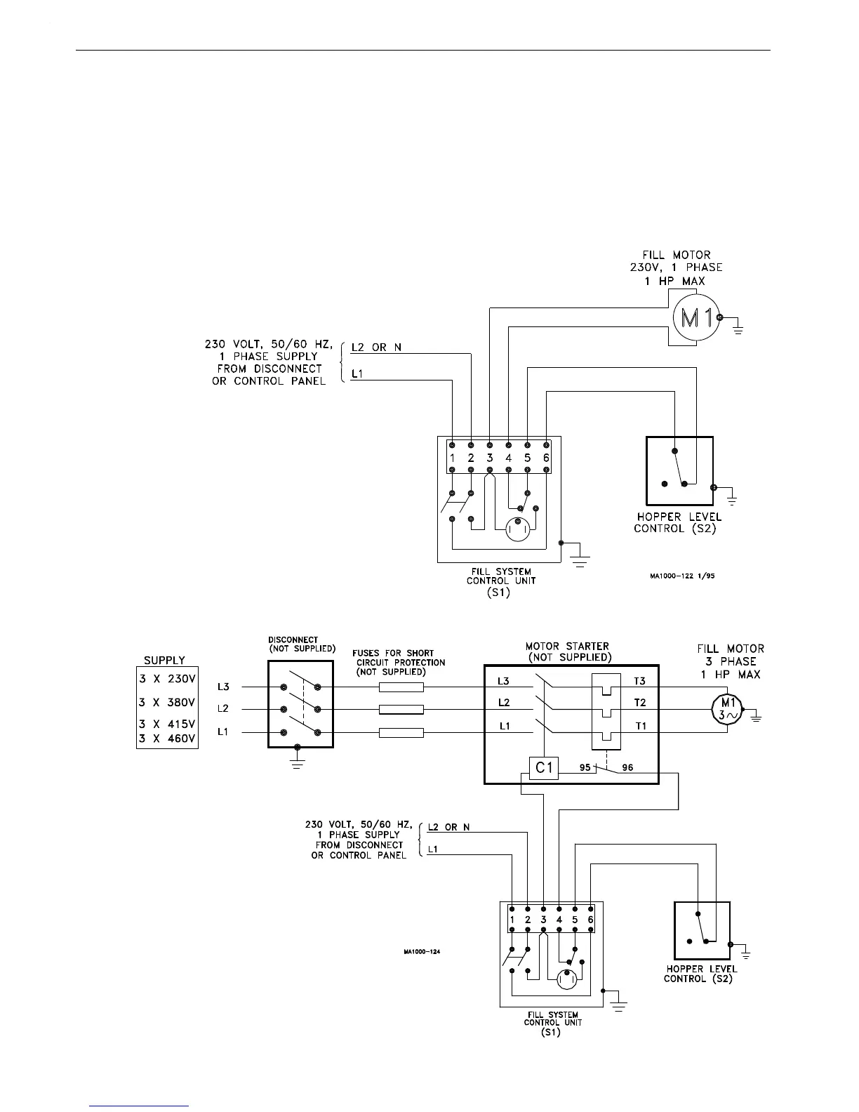 The wiring diagram for each type of delivery system shows how the hopper level control (drop tube switch is the